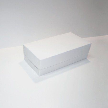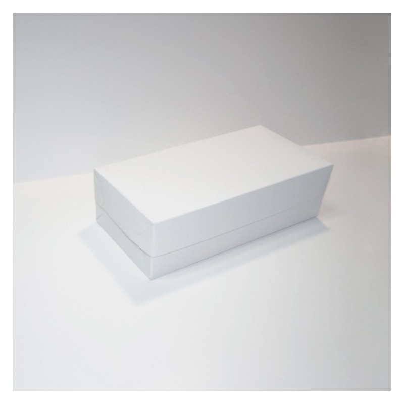 Białe opakowanie na pączki lub faworki. Kształt prostokątny, rozmiar 240x120x70 mm.
