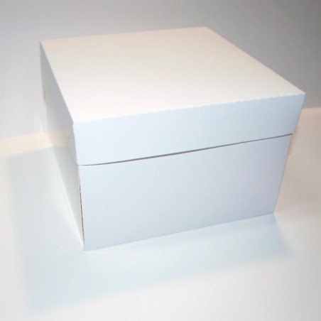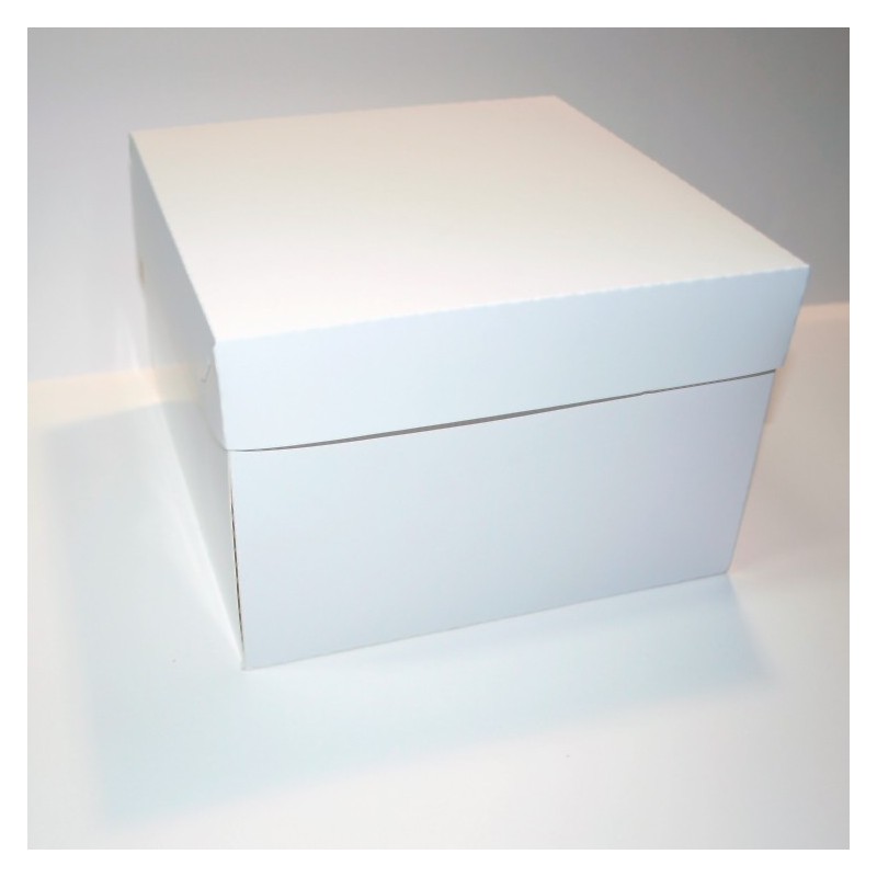 Białe, kwadratowe opakowanie do bezpiecznego transportowania tortu. Zamykane od góry.